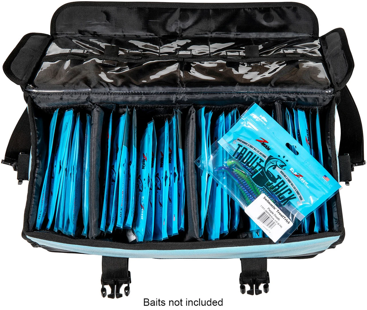 The Z-Man ElaZtech Bait LockerZ offers ample room to house over 50 packages of ElaZtech softbaits. Adjustable dividers isolate bait types and file packages upright and securely. Interior clear storage compartments with hook-and-loop closures provide additional jighead, hook and lure storage. Top flaps with magnetic closures help to prevent the lid from blowing open while locking water out. An exterior mesh pocket holds larger items like leader spools and tools. Constructed with durable 600 denier waterproof fabric, with a rugged rubberized base to prevent deck slippage. For easy transport, the Bait LockerZ features a lid handle and nylon shoulder strap.